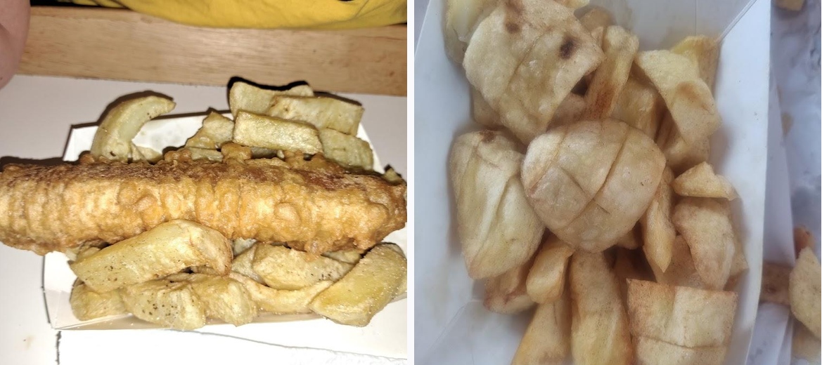 Excellent food. Haddock and large cod & scampi cooked to order. Sausage hot and waiting Large Chips then was enough for the family of four of us with the above. Haddock & Cod both absolutely excellent. Not greasy, excellent batter. Excellent for the area Pricey. But Fish & Chips is nowadays.